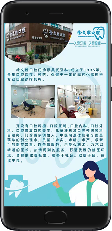 徐文勝口腔門(mén)診(原吳氏牙科)成立于1995年。是集口腔治療、預防、保健于一體的現代化高規格專(zhuān)業(yè)口腔診療機構。開(kāi)設有口腔種植、口腔正畸、口腔內科、口腔外科、口腔修復口腔美學(xué)、兒童牙科及口腔預防等科目服務(wù)。