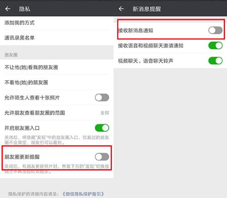同樣是設置頁(yè)面,隱私選項,將【朋友圈更新提醒】關(guān)閉,這樣一來(lái),無(wú)論什么時(shí)候有新朋友圈信息,都不會(huì )在“發(fā)現”按鈕上出現紅點(diǎn),吸引你點(diǎn)擊,久而久之,便會(huì )大大降低你刷朋友圈的欲望。