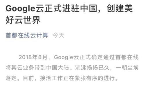 昨日,“首都在線(xiàn)云計算”公眾號發(fā)布消息稱(chēng),Google 云正式確定通過(guò)首都在線(xiàn)將其云業(yè)務(wù)帶到中國大陸,目前接洽工作正在緊張有序的進(jìn)行。按照公眾號文字內容來(lái)看,其實(shí)雙方的合作在 8 月就已落地,但遲遲未對外公布。截至雷鋒網(wǎng)發(fā)稿,該微信文已經(jīng)刪除。