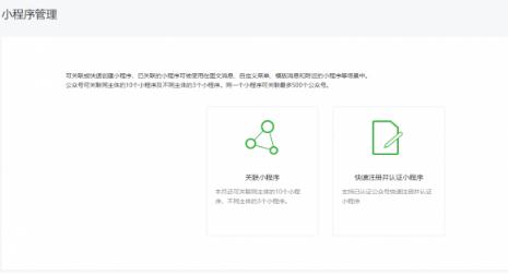 目前微信支持公眾號和小程序的互通關(guān)聯(lián)。微信公眾號可以快速關(guān)聯(lián)和創(chuàng )建小程序,小程序也可以展現公眾號的內容。已關(guān)聯(lián)的小程序可被使用在圖文消息、自定義菜單、模版消息和附近的小程序等場(chǎng)景中。公眾號可關(guān)聯(lián)同主體的10個(gè)小程序及不同主體的3個(gè)小程序。同一個(gè)小程序可關(guān)聯(lián)最多500個(gè)公眾號。通過(guò)微信公眾號后臺的小程序管理功能,只需要簡(jiǎn)單操作便可完成關(guān)聯(lián)和創(chuàng )建,并完成不同場(chǎng)景的展現。