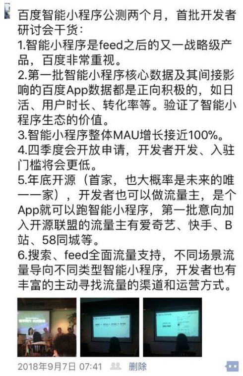 另一面,百度也不甘下風(fēng),在9月6日,百度舉辦了一次關(guān)于百度智能小程序的閉門(mén)會(huì )議,總經(jīng)理平曉黎在該場(chǎng)閉門(mén)會(huì )議上,向開(kāi)發(fā)者透露了百度智能小程序的關(guān)鍵數據,相關(guān)截圖,討論內容也已經(jīng)流出,各項數據也均讓人側目。