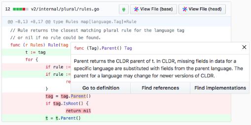 Sourcegraph 是一款能夠根據語(yǔ)義來(lái)把 Web 上的開(kāi)源代碼編入索引的代碼搜索瀏覽工具。你可以從代碼倉庫和安裝包,甚至是函數里搜索代碼,同時(shí)也可以直接點(diǎn)擊被完全創(chuàng )建了鏈接的代碼來(lái)閱讀文檔、跳轉到變量定義或者馬上找到可用的 Demo??偠灾?,你可以在你的 Web 瀏覽器上完成這一切,而不需要配置任何編輯器。由 Sourcegraph 出品的這款 Chrome 插件,可以非常方便地瀏覽和搜索 GitHub 上的代碼,持跨倉庫(repository)搜索、跳轉到定義、查找引用等功能,宛若一個(gè)功能強大的 IDE。核心功能如跳轉到定義(Go-to-definition) —— 瀏覽文件或查看 pull 請求時(shí),將鼠標懸停在代碼上可以查看文檔提示,單擊即可跳轉到定義、查找引用或全文搜索。