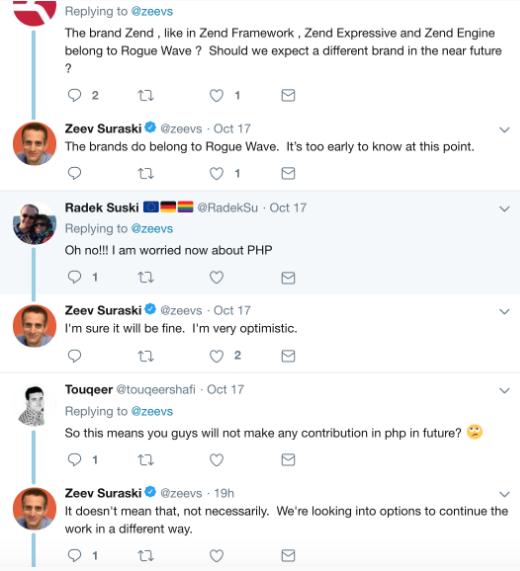 據悉,除了 Zend Engine ,Zeev Suraski 和其團隊目前還領(lǐng)導著(zhù) Zend Framework、Apigility 和 Zend Expressive 等組件的開(kāi)發(fā)工作,這些產(chǎn)品均歸屬于 Rogue Wave 。他們的退出,讓許多 PHP 開(kāi)發(fā)者和愛(ài)好者對 PHP 的未來(lái)表示擔憂(yōu)。Zeev 在推特上回復稱(chēng),他們正在探索是否有其他方式能繼續為 Zend Engine 和 PHP 8 做出貢獻。