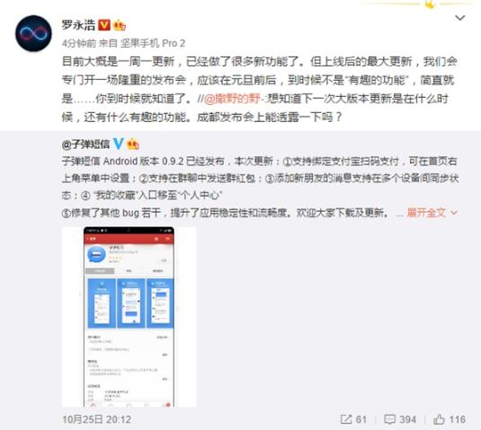錘子科技將于 11 月 6 日舉辦新品發(fā)布會(huì ),關(guān)于本次發(fā)布會(huì ),錘子科技 CEO 羅永浩透露將推出一款“沒(méi)人相信”的產(chǎn)品。除了這次發(fā)布會(huì )之外,羅永浩還透露子彈短信還將會(huì )召開(kāi)一場(chǎng)隆重的發(fā)布會(huì )。10 月 30 日消息,錘子科技 CEO 羅永浩表示,目前子彈短信大概是一周一更新,已經(jīng)做了很多功能。
