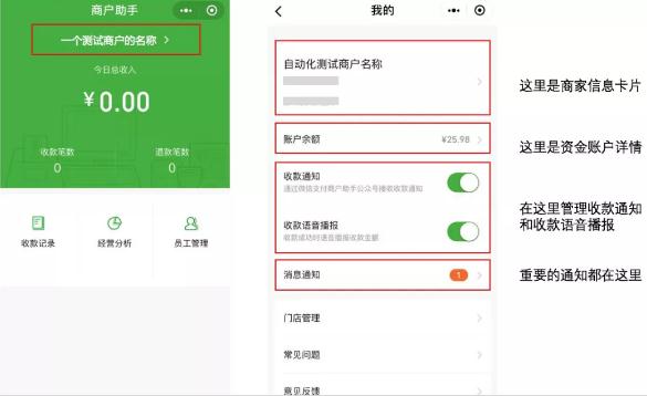 1、點(diǎn)擊商戶(hù)名稱(chēng)進(jìn)入“我的”頁(yè)面:商家信息、資金賬戶(hù)詳情、收款通知和語(yǔ)音播報、最新消息等內容一應俱全。