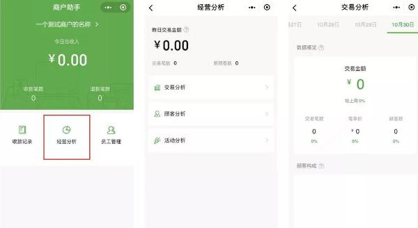 3、經(jīng)營(yíng)分析:商家可在此查看交易分析,顧客分析,活動(dòng)分析等數據信息,全方位了解經(jīng)營(yíng)現狀(經(jīng)營(yíng)數據會(huì )在每天早上8:00前更新展示)。