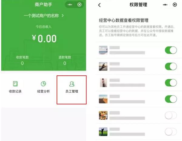 4、員工管理:超級管理員可以在此一鍵為其他員工開(kāi)通查看經(jīng)營(yíng)中心數據的權限(員工賬號需已在商戶(hù)平臺綁定微信號)。(邯鄲微信開(kāi)發(fā)