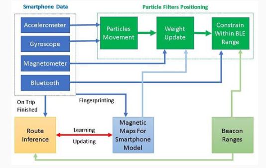 這個(gè)系統是自適應的,并不斷重復訓練,從而保證不同用戶(hù)和不同的智能手機型號都具有高精確度。其方法是分析終端用戶(hù)的定位會(huì )話(huà),從而增強系統的知識庫,以便為不同型號的智能手機讀取磁場(chǎng)數據。一旦用戶(hù)退出智能手機室內定位應用程序,系統將在云基礎結構中處理記錄的傳感器讀數,并嘗試重構用戶(hù)的路徑。這種新的技術(shù)稱(chēng)為“路徑推理”,它基于粒子濾波和形狀匹配。它允許研究人員在該區域的磁圖上添加新的信息層。因此,同一款智能手機的后續定位會(huì )話(huà)具有更高的準確率。