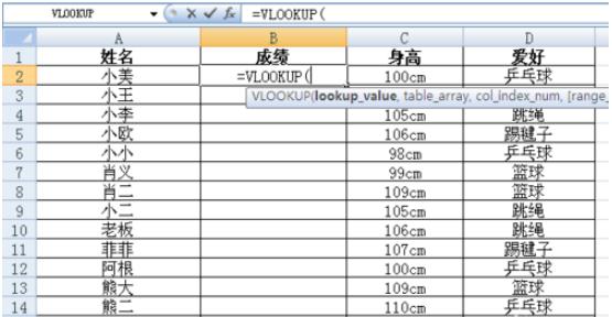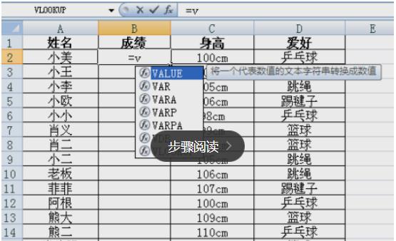 下面開(kāi)始使用函數查找,在英文輸入法的狀態(tài)下,在表二需要填充數據列“成績(jì)”的第一個(gè)單元格處輸入“=v”,出現一列函數后,雙擊選擇VLOOKUP。