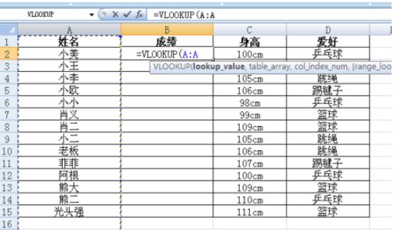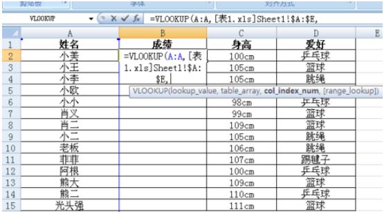 然后選擇你要查找成績(jì)的依據條件列,如表二是根據姓名來(lái)查找成績(jì),所以這里需要選擇表二的姓名所在列作為第一個(gè)參數(如下圖),接著(zhù)輸入一個(gè)逗號。