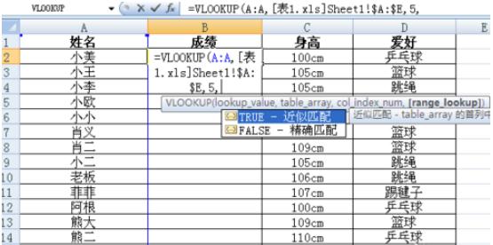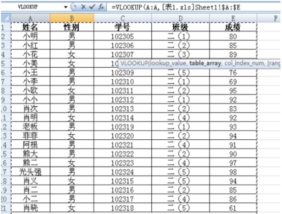 然后在函數光標處再輸入一個(gè)數字作為第三個(gè)參數,這個(gè)數字是代表我們要引用數據的表一成績(jì)欄在我們剛剛所框選的范圍的第幾列,我們這里是第五列,就是輸入“5”,接著(zhù)再輸入一個(gè)逗號(出現下圖),雙擊精準匹配。
