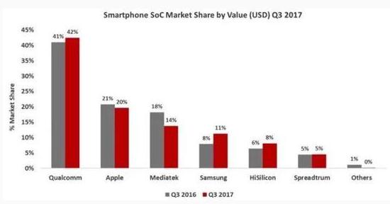 根據第三方數據,截至 2017 年第三季度,高通的市場(chǎng)占有率已達到 42%,這甚至超過(guò)第二名蘋(píng)果(20%)、第三名聯(lián)發(fā)科(14%)的總和。