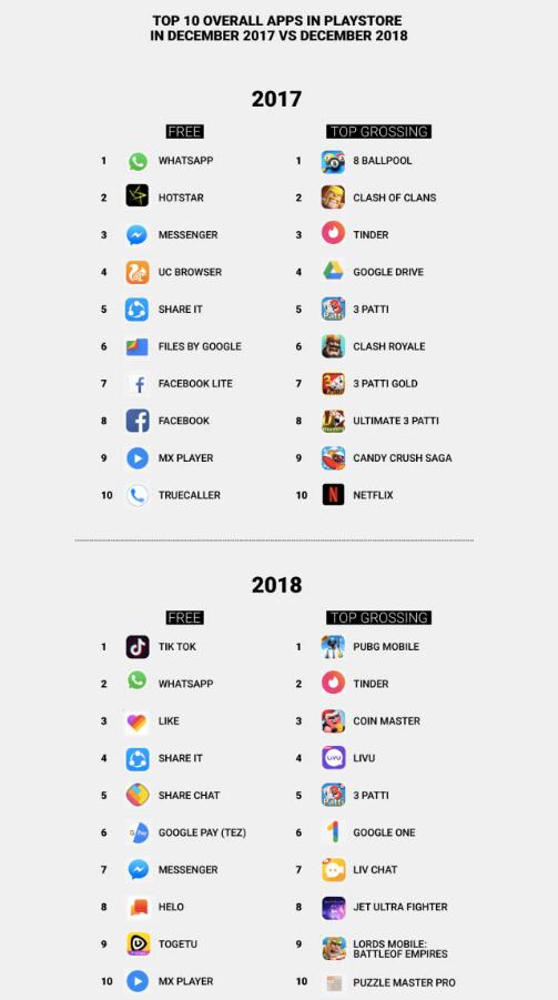 上述報告援引 Sensor Tower 的數據稱(chēng),在印度排名前十的 Android 應用中,有 5 款款應用程序來(lái)自中國;相對而言,在 2017 年底,在印度排名前十的 Android 應用中,只有 2 款應用程序來(lái)自中國。