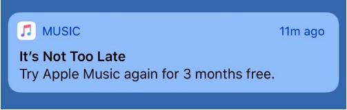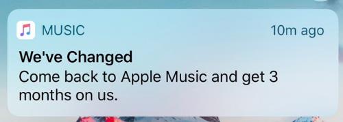 在過(guò)去一周中,蘋(píng)果向大量iOS用戶(hù)發(fā)出推送消息,提供給用戶(hù)額外的3個(gè)月AppleMusic免費試用。這些消息似乎是專(zhuān)門(mén)為那些AppleMusic老用戶(hù)準備的,這些用戶(hù)曾經(jīng)訂閱了AppleMusic,但后來(lái)取消了訂閱,或者是經(jīng)過(guò)第一次3個(gè)月免費試用后,沒(méi)有選擇訂閱而直接離開(kāi)的。
