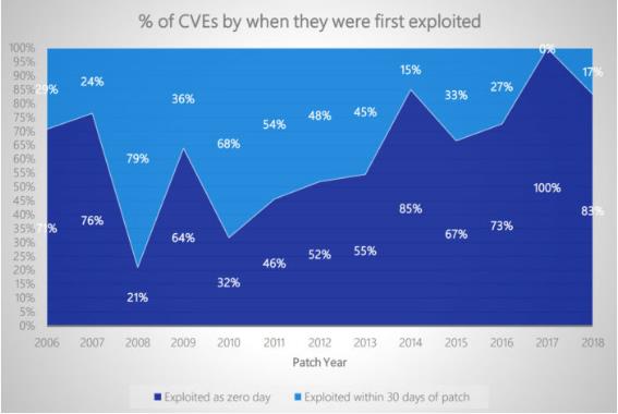 這說(shuō)明了微軟的安全部門(mén)工作起到了作用,且微軟像DEP,ASLR和改進(jìn)的沙盒等的安全功能運行效果良好。過(guò)去的幾年,在Windows分發(fā)補丁的30天內,漏洞被利用的比例只占2%到3%,在這期間內發(fā)布非0day漏洞現在也變得不常見(jiàn)。