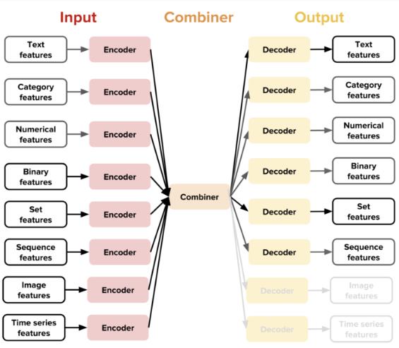 對于Ludwig支持的數據類(lèi)型(文本、圖像、類(lèi)別等),其提供了一個(gè)將原始數據映射到張量的編碼器,以及將張量映射到原始數據的解碼器(張量是線(xiàn)性代數中使用的數據結構)。內置的組合器,能夠自動(dòng)將所有輸入編碼器的張量組合在一起,對它們進(jìn)行處理,并將其返回給輸入解碼器。