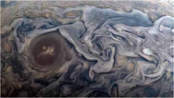 當 Juno 在木星北半球漂移時(shí),上面的圖片被機載 JunoCam 成像儀拍下來(lái)。圖片左側的大褐色斑點(diǎn)位于被稱(chēng)為 Jet N6 的區域的旋轉氣流中。