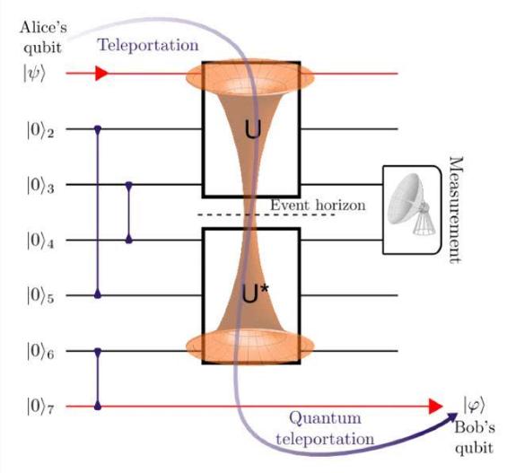 由馬里蘭大學(xué)的物理學(xué)家構建的七比特量子計算機電路,這個(gè)電路用量子傳態(tài)來(lái)檢測信息的擾亂。它和通過(guò)一個(gè)可穿越蟲(chóng)洞來(lái)實(shí)現信息傳輸是相似的,可以允許 Bob 來(lái)定出 Alice 扔進(jìn)黑洞的量子態(tài)。