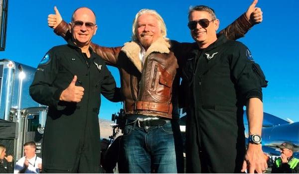 圖4:2018 年 12 月 13 日,維珍銀河公司的旅游飛船爬升到加州莫哈韋沙漠以上 80 千米高的地方后,布蘭森中心與飛行員共同慶祝