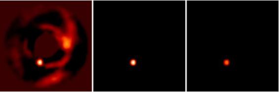 圖說(shuō):PDS 70b 行星的紅外圖像(左)看起來(lái)更像是具有一個(gè)環(huán)繞其運行的圓盤(pán)(中),而不是單單一顆行星(右)