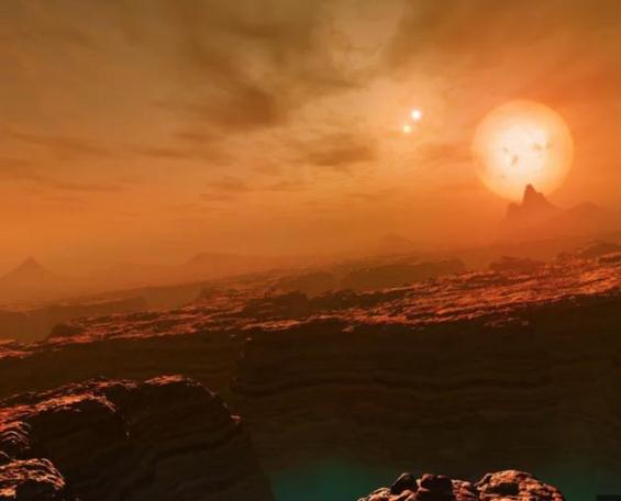如果你站在這顆行星的表面,由于這顆行星圍繞恒星運行時(shí),距離僅相當于水星到太陽(yáng)距離的1/10,你抬頭會(huì )看到天空中一個(gè)巨大的橘色太陽(yáng),以及不遠處兩個(gè)稍小一些的橘色太陽(yáng),它圍繞運行的那顆恒星看上去會(huì )顯得非常巨大,因為它距離非常近,而另外兩顆恒星看上去就要遠得多,它們的亮度將大約是我們在地球上看到的金星亮度的 100 倍以上,這兩顆恒星的大小看上去差不多。