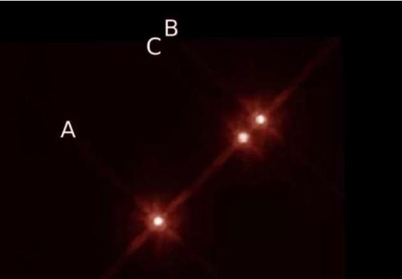 哈勃空間望遠鏡拍攝的三恒星系統圖像。新發(fā)現的系外行星圍繞其中編號為“A”的恒星運行。