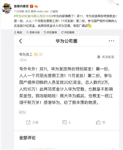 11 月 11 日晚間,針對網(wǎng)傳華為雙 11 發(fā) 20 億元獎金的消息,華為內部員工回復騰訊科技稱(chēng):“全員發(fā)放一個(gè)月工資的陽(yáng)光普照獎,20 億的獎金不清楚,本人未收到相關(guān)郵件。”