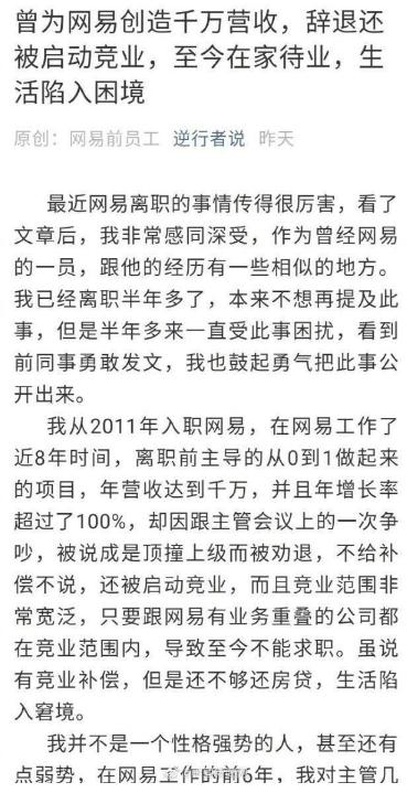 文章作者稱(chēng),自己2011年入職網(wǎng)易,在網(wǎng)易工作了近8年時(shí)間,是一名技術(shù)人員,離職前主導的從0到1做起來(lái)的項目,年營(yíng)收達到千萬(wàn),并且年增長(cháng)率超過(guò)了100%。因跟主管會(huì )議上的一次爭吵,被說(shuō)成是頂撞上級而被勸退,不給補償不說(shuō),還被啟動(dòng)競業(yè),而且競業(yè)范圍非常寬泛,只要跟網(wǎng)易有業(yè)務(wù)重疊的公司都在競業(yè)范圍內,導致至今不能求職。雖說(shuō)有競業(yè)補償,但是還不夠還房貸,生活陷入窘境。