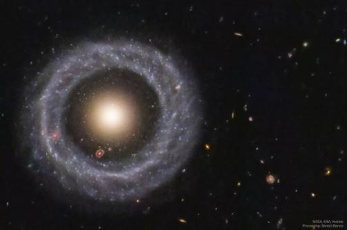 1950 年,當天文學(xué)家阿瑟·霍格(Arthur Hoag)偶然發(fā)現這顆不尋常的銀河系外天體時(shí),這個(gè)問(wèn)題開(kāi)始浮現。它的外圍是由明亮的藍色恒星組成的環(huán)狀物,而中心處的圓球則主要是由許多可能較老的紅色恒星構成。介于兩者之間的是一道幾乎完全黑暗的裂縫。雖然這些類(lèi)似的天體已被識別出,并被歸類(lèi)為環(huán)狀星系,但是“霍格天體”是如何形成的,目前仍是個(gè)謎。