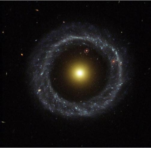 雖然我們有大量的環(huán)狀星系,但霍格天體仍然與眾不同。一個(gè)無(wú)法解釋的特性是它的極端圓度。核心可能是球狀的(甚至不是橢圓形的),環(huán)本身是非常圓的。這非常奇怪,而且是在大多數其他環(huán)星系中看不到的。這一完美形狀可能與霍格天體的形成有關(guān)。