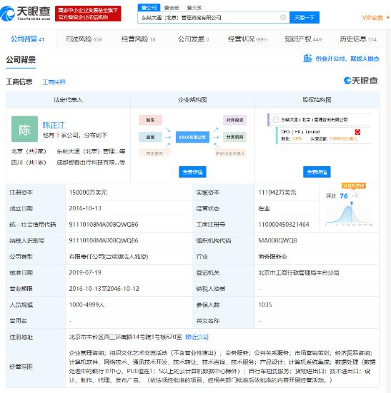 天眼查數據顯示,ofo 運營(yíng)主體為東峽大通(北京)管理咨詢(xún)有限公司,該公司成立于 2016 年 10 月,注冊資本為 15 億美元,法定代表人為中國區業(yè)務(wù)主要負責人之一陳正江,是 OFO (HK) Limited 的全資子公司。