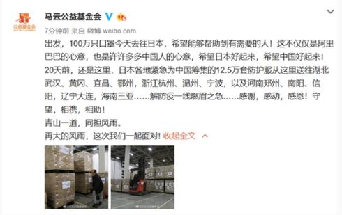 今天,馬云公益基金會(huì )、阿里巴巴公益基金會(huì )通過(guò)微博中表示,將捐贈 100 萬(wàn)只口罩用于支持日本“抗疫”。