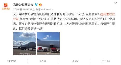 馬云公益基金會(huì )發(fā)布微博稱(chēng),“又一架滿(mǎn)載防疫物資的航班抵達比利時(shí)列日機場(chǎng)!馬云公益基金會(huì )和阿里巴巴公益基金會(huì )捐贈的 150 萬(wàn)只口罩將從這兒送達法國、斯洛文尼亞和比利時(shí)三個(gè)國家。更多的防疫物資還會(huì )運到列日機場(chǎng),從這里送達歐洲其他國家。疫情還在蔓延,我們還要更快一點(diǎn)!”