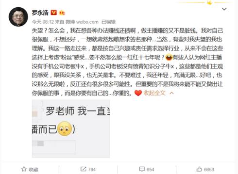 今日,羅永浩發(fā)布微博回應稱(chēng),不應該感到失望,自己在想各種辦法賺錢(qián)還債,而且做主播帶貨賺的不是臟錢(qián)。
