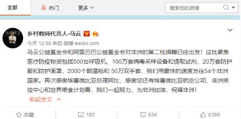 4 月 6 日,馬云再次發(fā)布微博表示,馬云公益基金會(huì )和阿里巴巴公益基金會(huì )對非洲的第二批捐贈已經(jīng)出發(fā)!這批緊急醫療防疫物資包括 500 臺呼吸機、100 萬(wàn)套病毒采樣設備和提取試劑,20 萬(wàn)套防護服和防護面罩,2000 個(gè)額溫槍和 50 萬(wàn)雙手套,我們用最快的速度發(fā)往 54 個(gè)非洲國家。