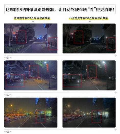 “車(chē)載攝像頭圖像質(zhì)量的大幅提升,提高了自動(dòng)駕駛的檢測識別能力,進(jìn)一步保障了自動(dòng)駕駛的安全性。”達摩院自動(dòng)駕駛實(shí)驗室高級技術(shù)專(zhuān)家廣瞻指出,通過(guò)達摩院獨有的 3D 降噪和圖像增強算法,達摩院 ISP 處理器幫助扮演自動(dòng)駕駛車(chē)輛“眼睛”角色的攝像頭,有了更好的“視力”,夜間環(huán)境下看得更清晰。