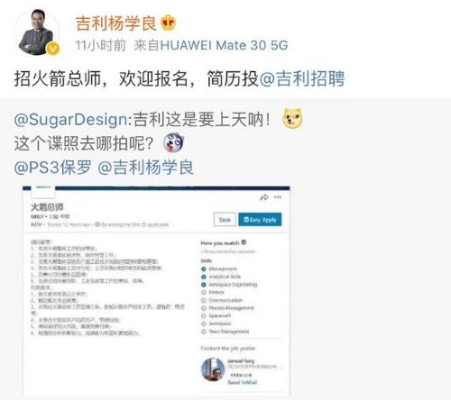 有消息稱(chēng)“吉利科技集團下屬公司浙江時(shí)空道宇科技有限公司(下稱(chēng)時(shí)空道宇)招聘火箭總工程師”。對此,吉利汽車(chē)集團副總裁楊學(xué)良在其微博表示“招火箭總師,歡迎報名。”4 月 17 日晚,吉利汽車(chē)集團副總裁楊學(xué)良向新京報記者證實(shí)招聘消息屬實(shí)。