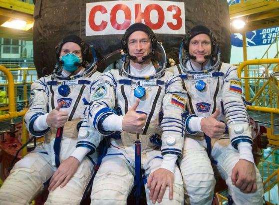 NASA 宇航員 Kate Rubins、俄羅斯宇航員 Sergey Ryzhikov 和 Sergey Kud-Sverchkov 在“聯(lián)盟 MS-17”號飛船前(依次從左往右)