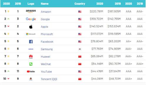 近日,英國品牌評估機構“品牌金融”(Brand Finance)發(fā)布“2020 全球最有價(jià)值的 100 大科技品牌”(Tech 100 2020) 榜單,榜單共有 20 個(gè)中國科技品牌上榜,包括華為、微信、QQ、淘寶、天貓等。