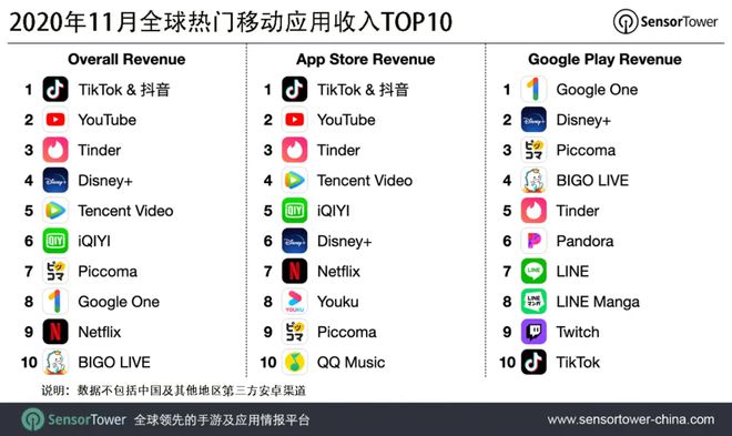 營(yíng)收榜第二至五名分別為 YouTube,美國約會(huì )軟件 Tinder,流媒體平臺 Disney+ 和騰訊視頻。