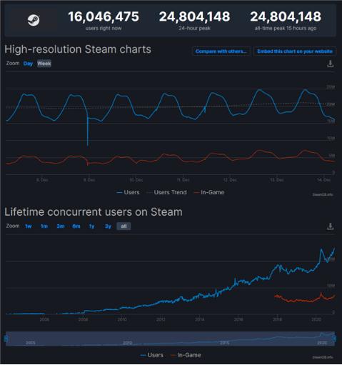 Steam 平臺今天創(chuàng )下了一個(gè)新的紀錄,同時(shí)在線(xiàn)玩家最高達到 24804148 人,打破了今年 4 月份疫情期間創(chuàng )造的 24535923 人,而自從今年 3 月以來(lái),Steam 平臺同時(shí)在線(xiàn)玩家數就一直穩定在 2000 萬(wàn)人以上。