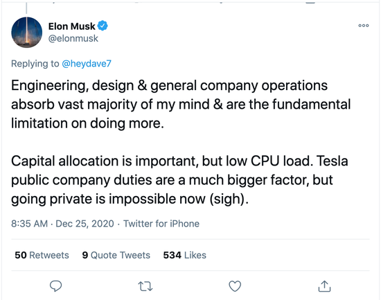 今日,特斯拉 CEO 埃隆·馬斯克發(fā)推稱(chēng),各種公司運營(yíng)的事務(wù)令他精疲力盡,沒(méi)有精力兼顧其他,因此現在想私有化特斯拉是不可能的。