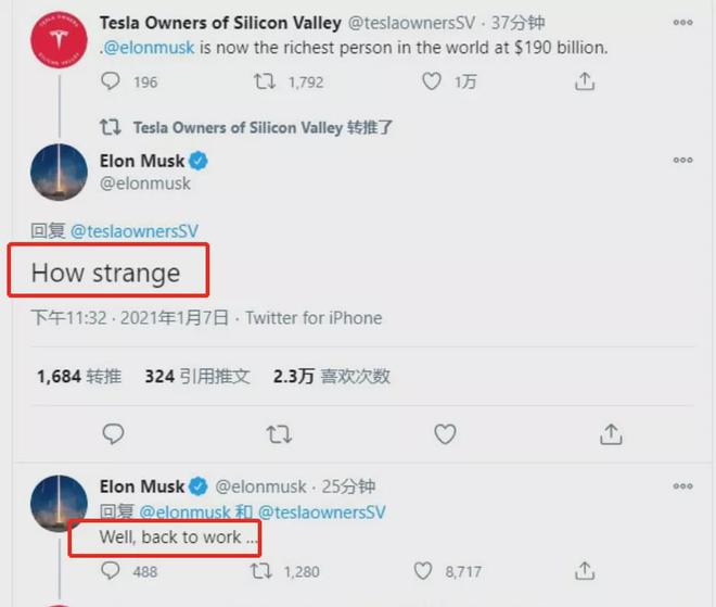 對于成為首富,馬斯克不以為然,其在社交媒體上發(fā)文稱(chēng):“真奇怪,好吧,繼續工作......”