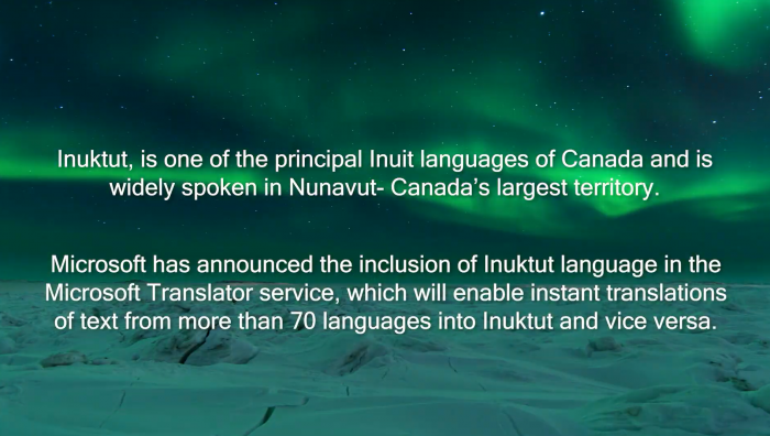 在努納武特地區政府的幫助下,微軟得以添加對該語(yǔ)言的支持,而因紐特語(yǔ)使用者通過(guò)跟微軟的合作以確保翻譯正確。