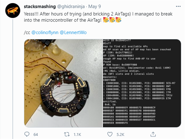 可是,就在A(yíng)irTag正式發(fā)售的第 10 天(AirTag 于 4 月 30 日正式發(fā)售),即 5 月 9 號蘋(píng)果就被“打臉”了:一位德國安全研究人員 Stack Smashing 發(fā)推表示他能“入侵 AirTag 的微控制器”,還能修改其丟失模式下的NFC URL,而這個(gè) URL 可被黑客用于網(wǎng)絡(luò )釣魚(yú)或其他任何入侵操作!