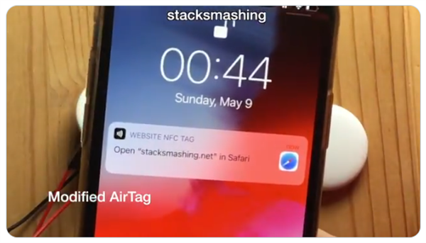 破解版 AirTag:由于入侵微控制器對 NFC URL 經(jīng)過(guò)了修改,因而會(huì )提示手機打開(kāi)一個(gè)自定義的 URL“stacksmashing.net”。