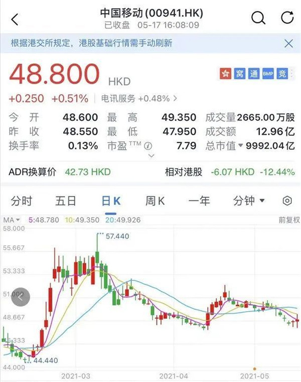截至17日收盤(pán),中國移動(dòng)在港股的市值有近一萬(wàn)億!
