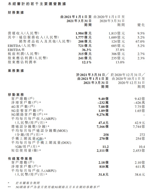 財務(wù)數據顯示,一季度,中國移動(dòng)營(yíng)運收入為1984億元,比上年同期增長(cháng)9.5%。其中,通信服務(wù)收入為1777億元,比上年同期上升5.2%。股東應占利潤為241億元,比上年同期上升2.3%。
