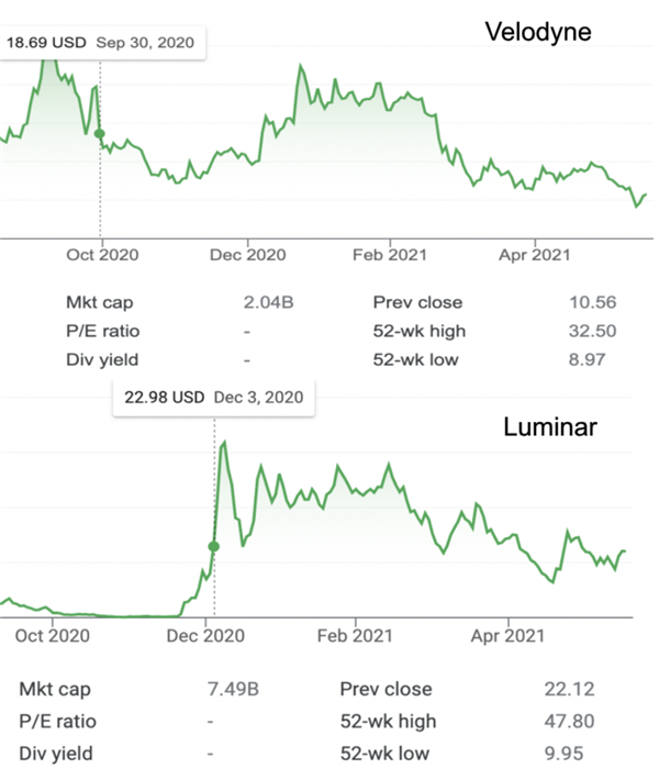 有趣的是,這些上市激光雷達公司的股票在經(jīng)歷曇花一現的高潮后,便開(kāi)始一路走低,如今又幾乎回到了他們的發(fā)行價(jià)水平線(xiàn)上。
