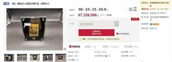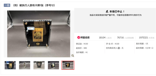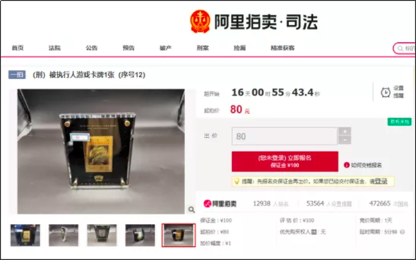 2021年6月21日,安徽省滁州市,滁州市中級人民法院以80元的底價(jià)在阿里法院拍賣(mài)平臺上掛出了一張編號為“No.12”的青眼白龍金卡,截止拍賣(mài)前圍觀(guān)人數達2,011,227次,共有18,104人報名拍賣(mài),僅以每人100元押金計算,押金總額就達1,810,400元。